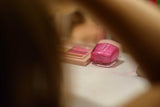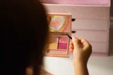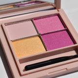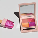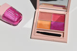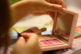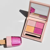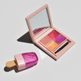4 matte and glow cream to powder shades lay in a palette to use either on their cheeks and eyes, finishing off with a shimmery lipgloss in the form of a popsicle stick creating a perfectly playful day, fun dress up moment or to use for when they want to get ready with mommy.